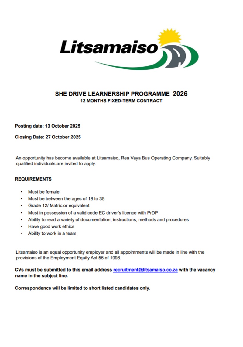 Applications for the Litsamaiso She Drive Learnership must be submitted before the closing date on 27 October 2025.