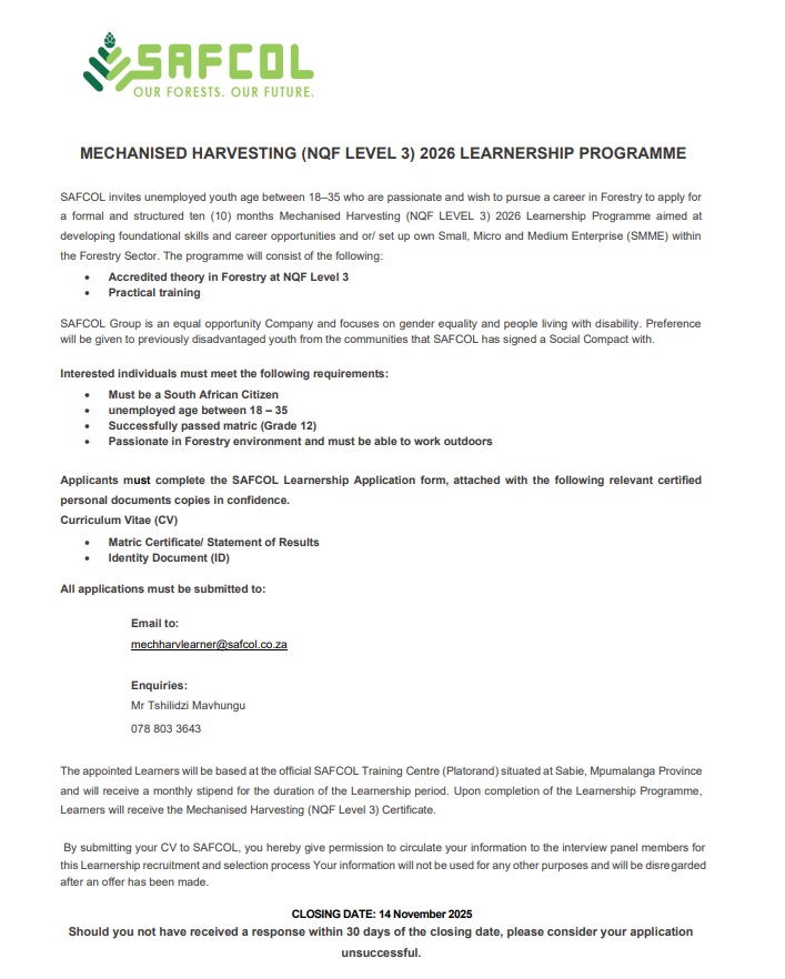 Applications for the SAFCOL (South African Forestry Company Limited) Mechanised Harvesting Learnership must be submitted to the selection committee before the closing date on 14 November 2025.
